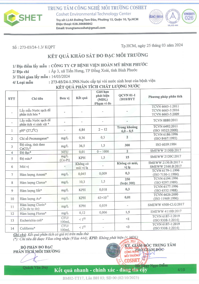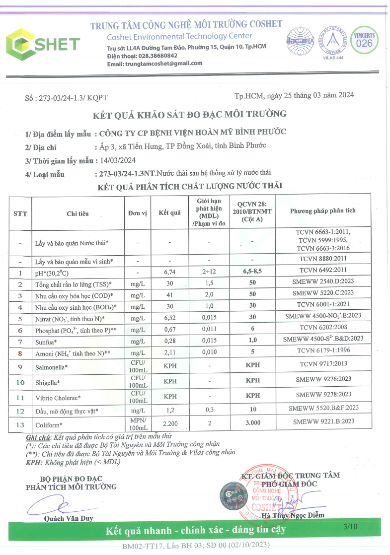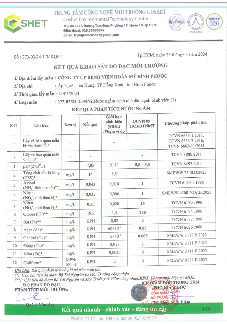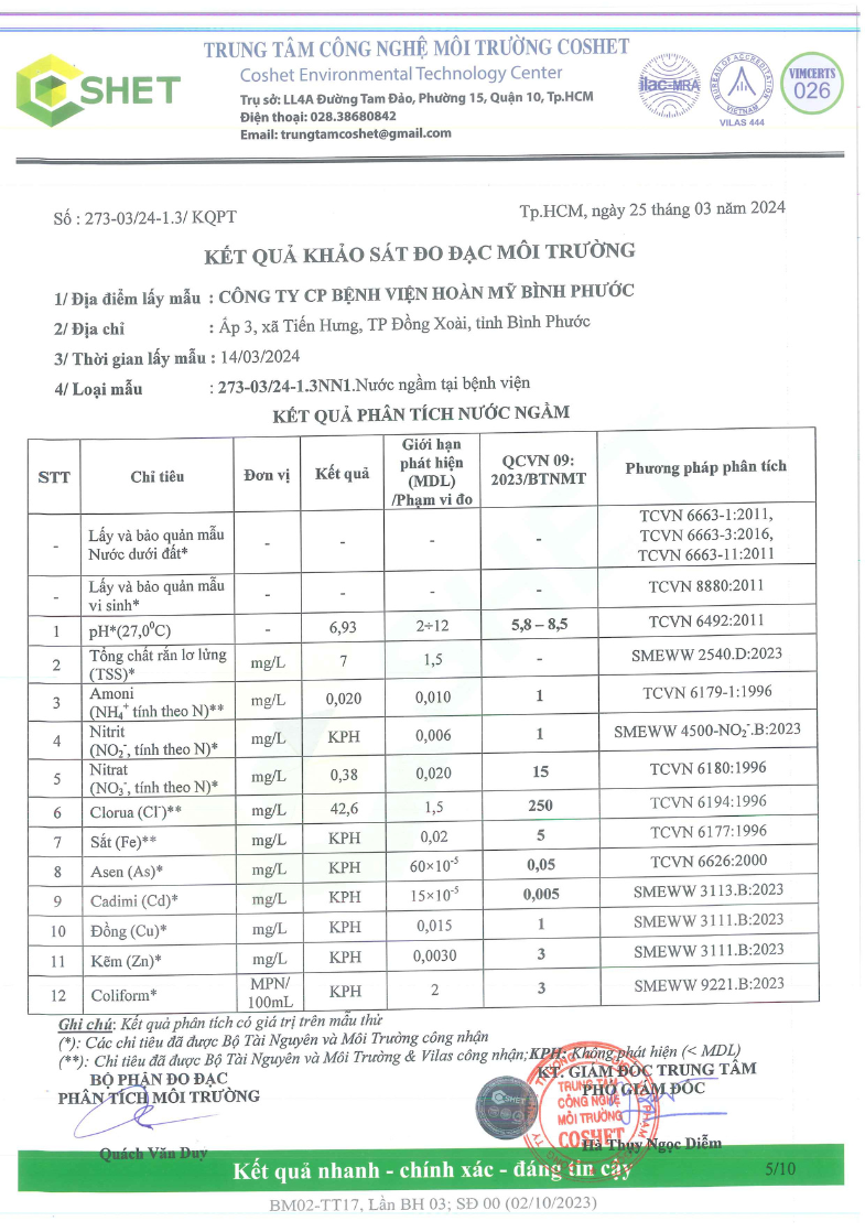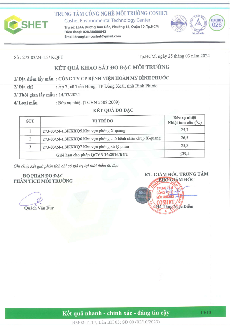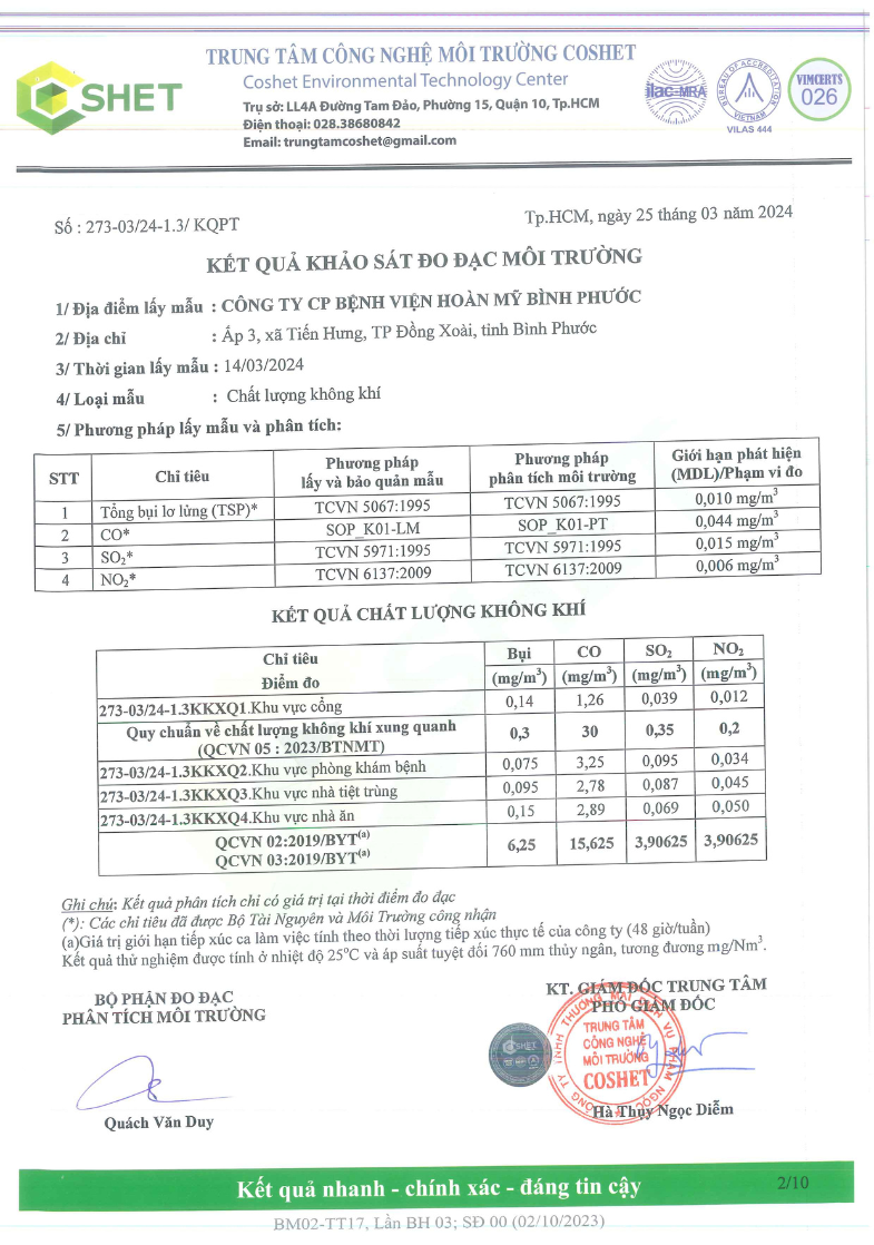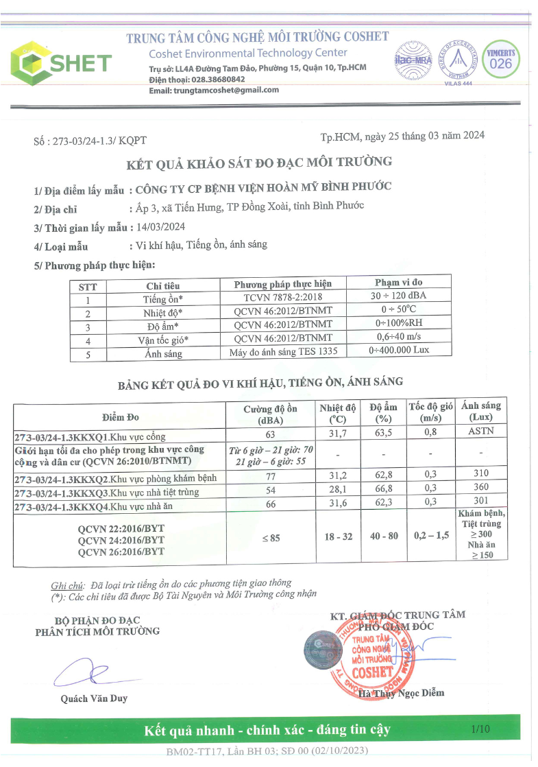 Kết quả quan trắc học quý I – 2024 Bệnh viện Hoàn Mỹ Bình Phước